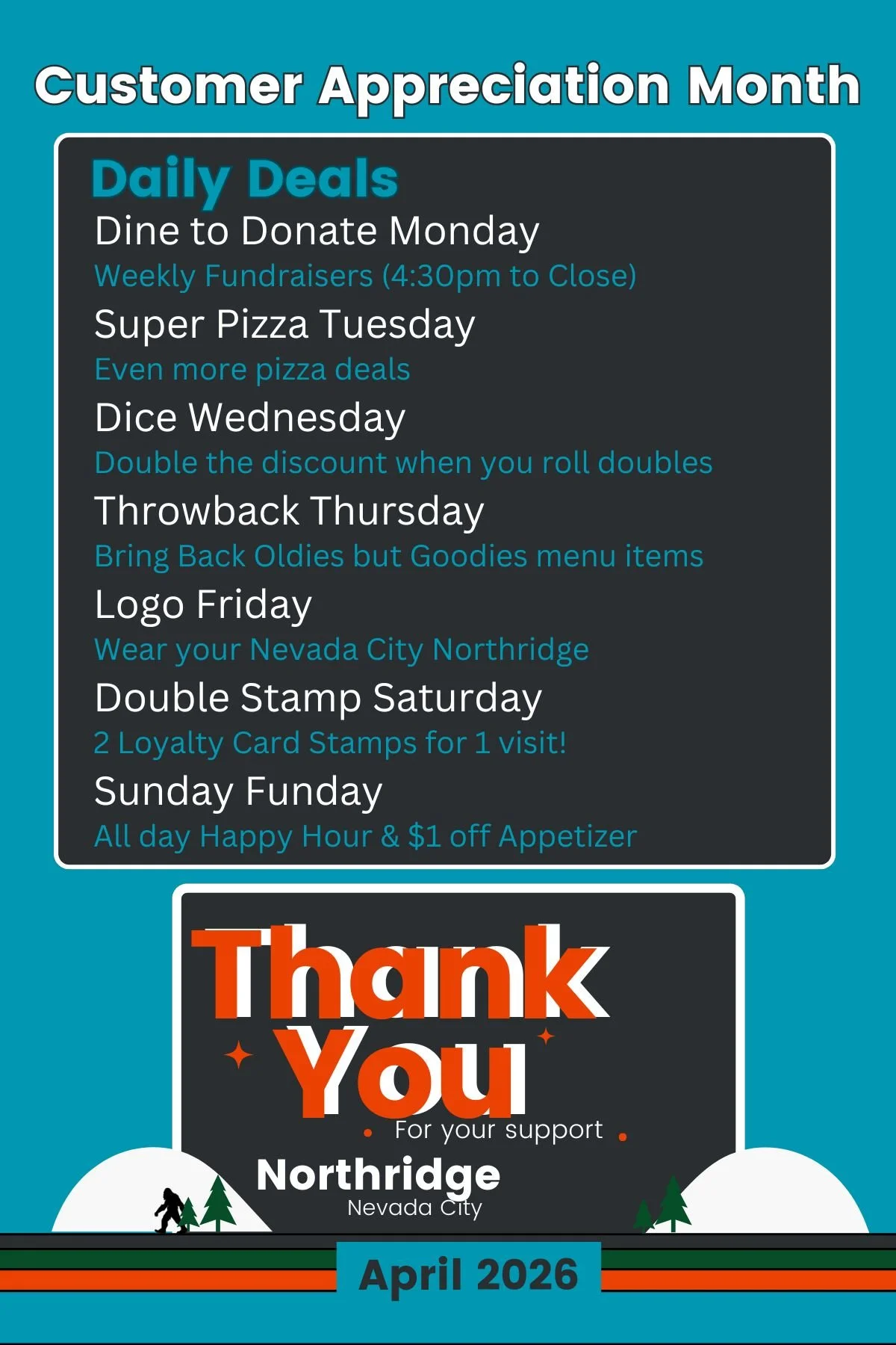 The Northridge in Nevada City is a Nevada County favorite. It’s a warm and casual place to get a great meal, a cold beer, and spend time with your family and friends. We have special menus on Mon, Tues, Thur, and Fri. We have happy hour Monday through Friday. And you can get a slice of bacon and beer every day of the week from 4-5 pm. Stop by and say hi!
